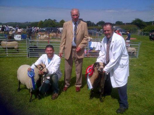 Aberystwyth Show June 2014. Champion Badger Sheep - Yearling Ram. Reserve Champion - Yearling Ewe. Both property of Meirion and Dafydd Williams, seen here with Judge Mr Brian Eagles.